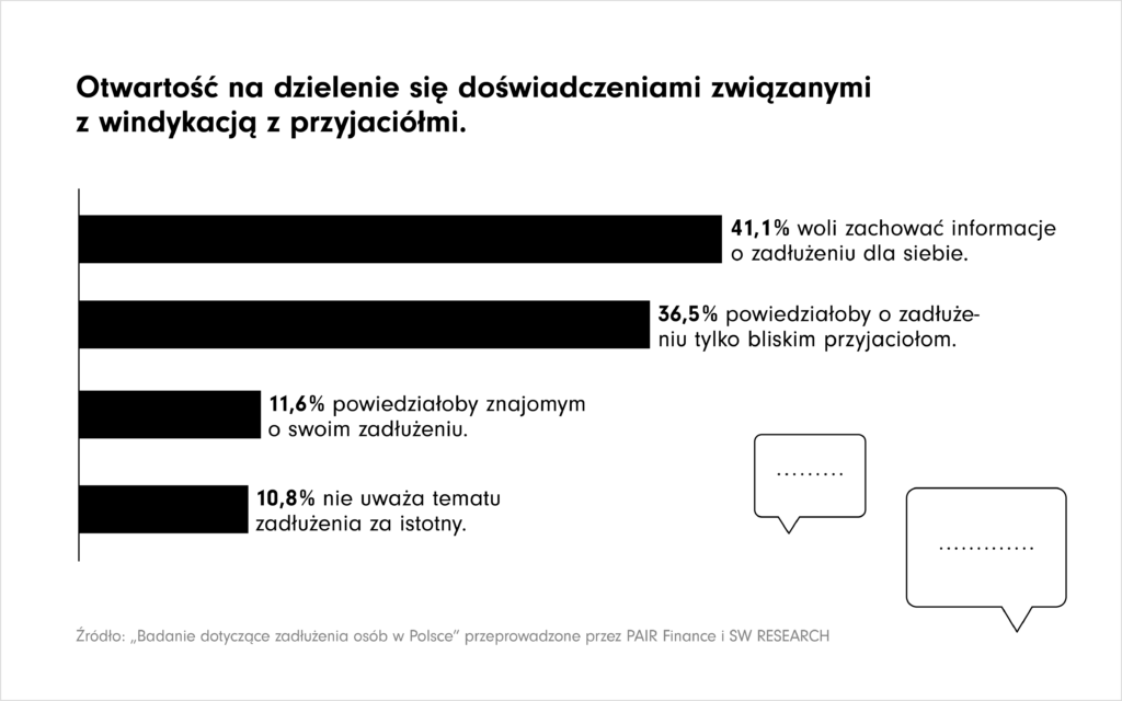Windykacja pozostaje dla wielu Polaków tematem wrażliwym. Ponad 40% badanych nie powiedziałoby nikomu, że ma kontakt z firmą windykacyjną. Ponad 35% zwierzyłoby się tylko najbliższej rodzinie. Jedynie 11,6% przyznałoby się znajomemu, że ma dług lub kontaktował się z nimi windykator. Dług pozostaje więc tematem tabu.